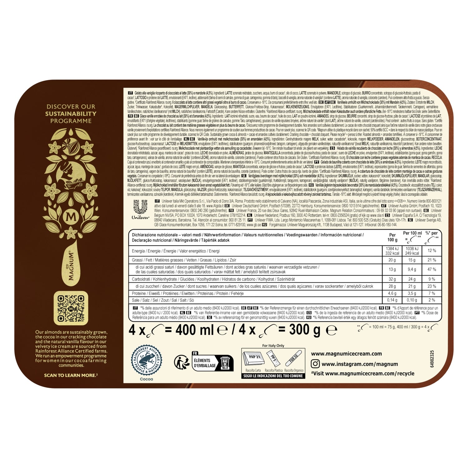 Offrez-vous le MAGNUM Glace Bâtonnet Amande, un dessert glacé premium qui marie le parfum d'amande à l'enrobage chocolat emblématique de Magnum pour une expérience gourmande inoubliable.