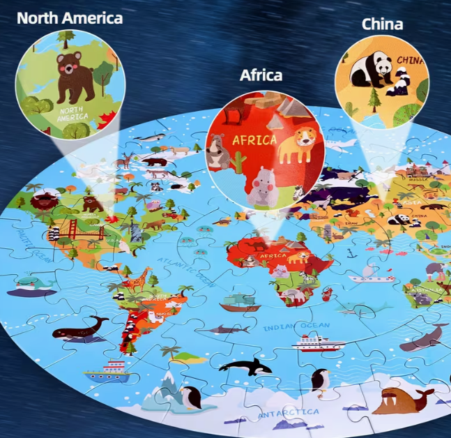 Les enfants assemblent des pièces rondes illustrant des animaux et des motifs simples, puis racontent des histoires autour de leur scène animale. Ce jeu stimule l’éveil et la coordination tout en favorisant l’imagination et les échanges lors des sessions de jeu.